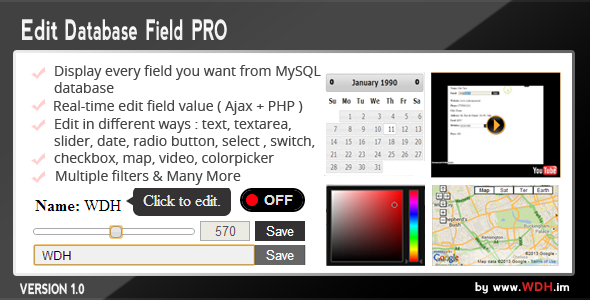 Edit Database Field PRO is a web script which help you to display the field you want from database and you can edit it with Ajax ( without reloading page ).The Field can be edit in different types : text , textarea, select , radio button, date , slider, colorpicker, switch on/off button, google map location box, video player autogenerate from youtube links; (soon: time and upload)