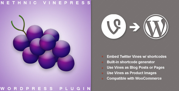 Nethnic VinePress – WordPress and WooCommerce plugin Embed Vines in WordPress and WooCommerce w/shortcode and generator. This plugin allows you to easily embed Twitter Vines anywhere in your WordPress site or WooCommerce shop: blog posts, site pages, product descriptions. Any plugin supporting shortcodes should be just ready to host Vines instead of static images