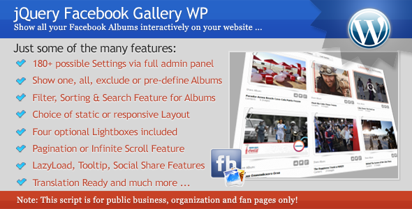 The jQuery Facebook Gallery WP plugin allows you to show all your Facebook albums (images) on your website. Please note that this script will only work with Facebook pages that belong to businesses or organization or pages that are registered as fan pages. It will NOT work with personal Facebook profiles. Also, please make sure that the Facebook page you want to use has no active age restrictions since these restrictions require authentication and access tokens for each user.