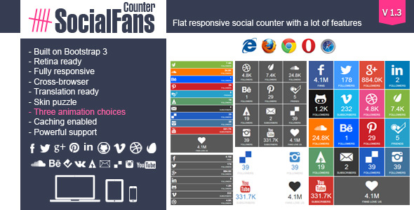 Last Update: 3 December 2013 – Latest Version 1.3 Retina Responsive WordPress plugin displaying your social accounts fans, subscribers and followers number with a lot of features coming with 18 social networks like facebook, linkedin, pinterest , twitter and 14 other social networks key features Built on Bootstrap 3 Retina ready Fully responsive Fit any of sidebars width Animated effects Cross-browser – Chrome, Firefox, Opera, Safari, IE8, IE9, IE10 and IE11 (Animations IE10+) Translation ready (
