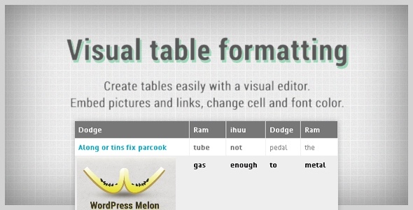 Visual Table Formatting from WP Melon Creating and managing colorful tables has never been more intuitive and straightforward with this plugin. The visual editor lets you add, edit, change cell formatting in a familiar, spreadsheet-like way. Avoiding the database, all the data is stored in a single shortcode, thus making it extremely easy to transfer between different posts or wordpress installations
