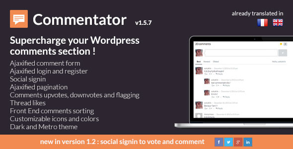 Commentator Wordpress Plugin is a fully featured ajaxified comments system for your wordpress website that let you easily supercharge your discussions. Plugin Features NEW v1.5 : Dark Theme – Dark Theme for dark websites. NEW v1.4 : Comments flagging – Ajax flagging of unappropriated comments